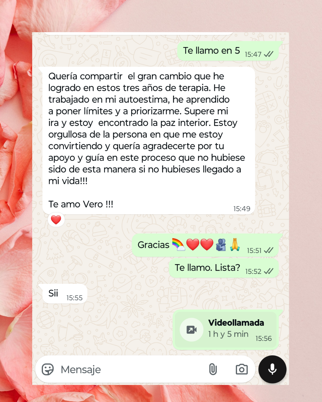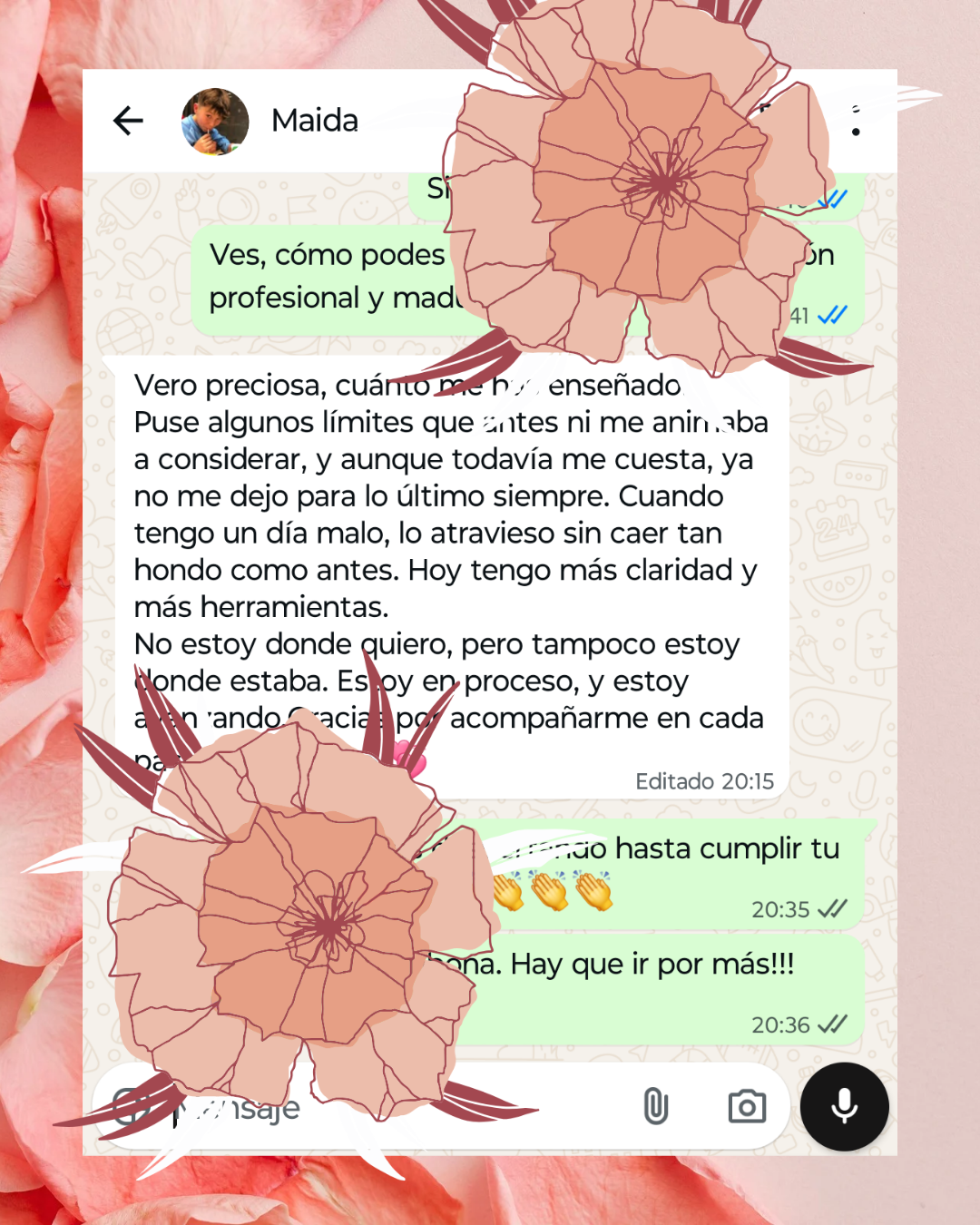 Me ayudó a cambiar puntos de vista, aprender a aceptar y trabajar en eso, en no enfocarme en lo que me molesta tomando todo personal, en valorarme, en prestar atención en disfrutar y dejar que las cosas fluyan dejando de suponer todo el tiempo, podría seguir. Gracias a este trabajo de corto plazo, sabiendo que todavía me faltan temas que resolver, afirmó que estoy atravesando mi mejor versión y que me sigue sorprendiendo la autoestima que aprendí a manejar. ¡Voy por más! Super agradecida!