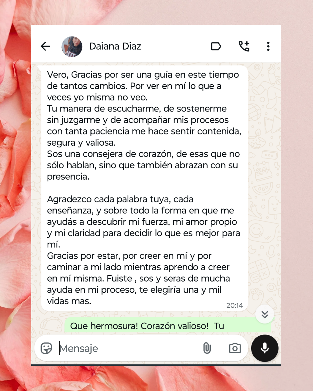 Hola, mi nombre es María Rosa Bondaz. Yo soy una sobreviviente , vengo de una niñez y adolescencia difícil , una familia disfuncional y reiterados abusos etc. Llegué al conocimiento de esta terapia de autoayuda ( de autoconocimiento) dictado por Verónica, una mujer empática, bondadosa que a través de su conocimientos y amor me ayudó a conocerme y poder tomar decisiones que cambiaron y están cambiando mi vida . Salí de vivir en adulterio, aprendí el valor que Dios puso en la mujer y que todas somos profetas de nuestra vida . Y aún seguiré viendo cambios e iré creciendo para alcanzar el diseño que Dios me dio desde mi embrión. Sumamente agradecida a Dios y a este acompañamiento. Súper recomendable!!
